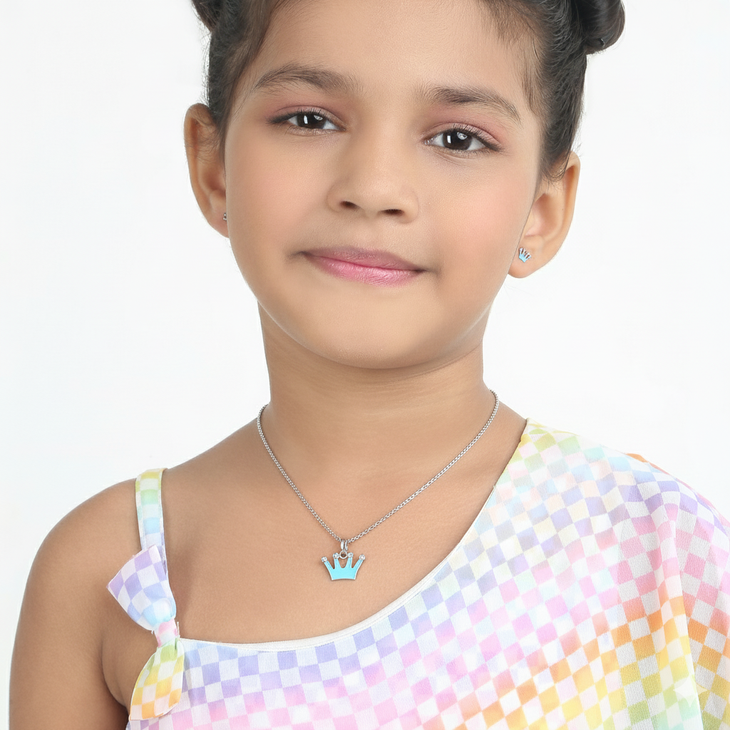 Let your little one feel like royalty with this adorable Blue Princess Crown Kids Jewellery Set! This charming three-piece collection includes a necklace, a matching adjustable ring, and a pair of delicate stud earrings. Each piece is crafted from pure silver and features a whimsical blue enamel crown design, adorned with tiny sparkling stones. It’s the perfect set to celebrate her special moments and add a regal touch to her everyday look.