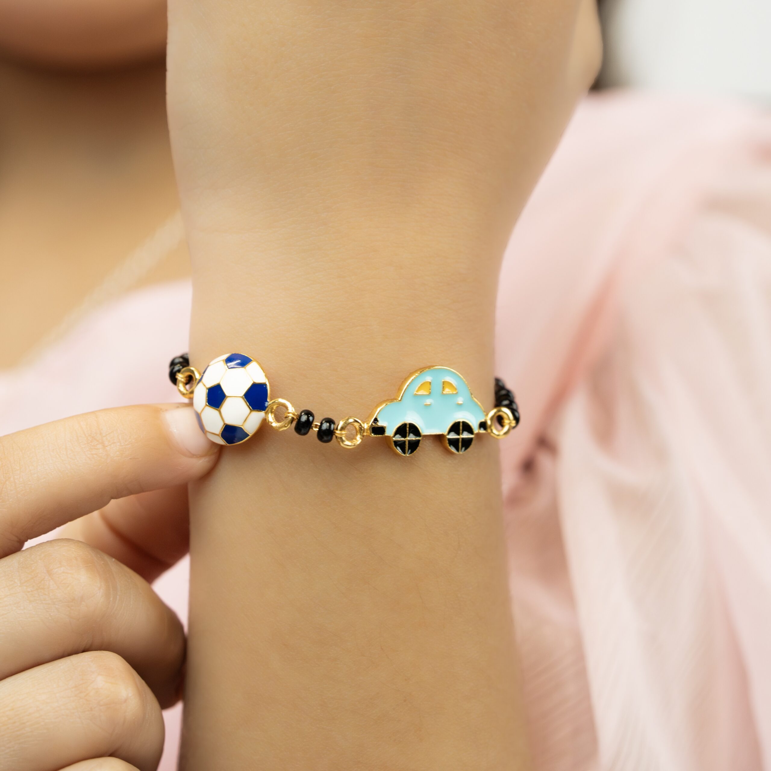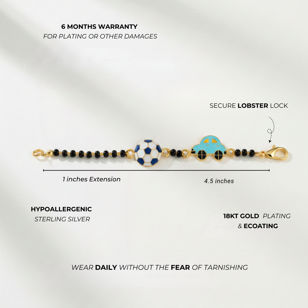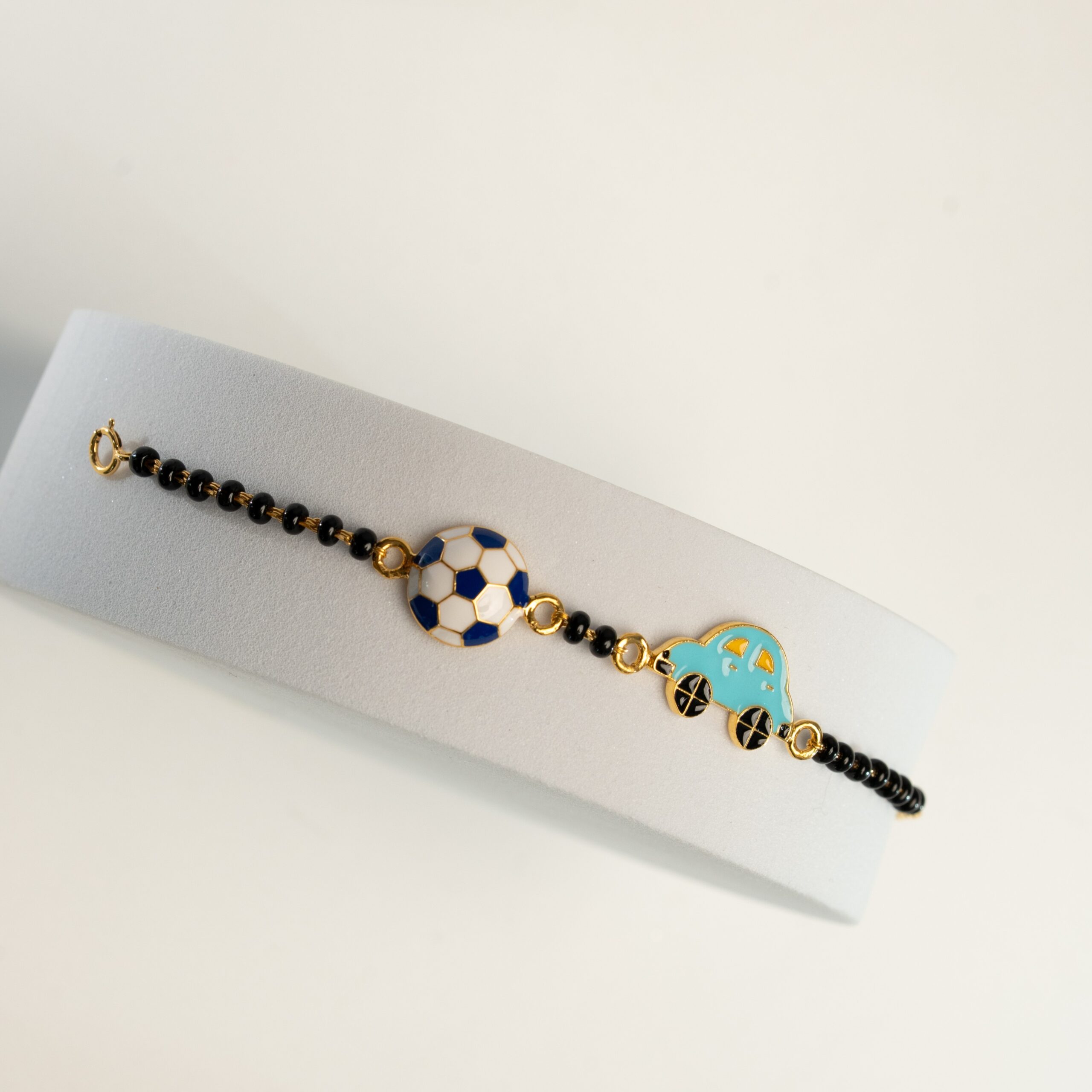 Zoom into fun with this sporty nazariya that brings together two childhood favorites – a bright blue car and a classic football! Designed for active little boys, this piece is crafted with hypoallergenic materials and traditional black beads for both charm and protection.