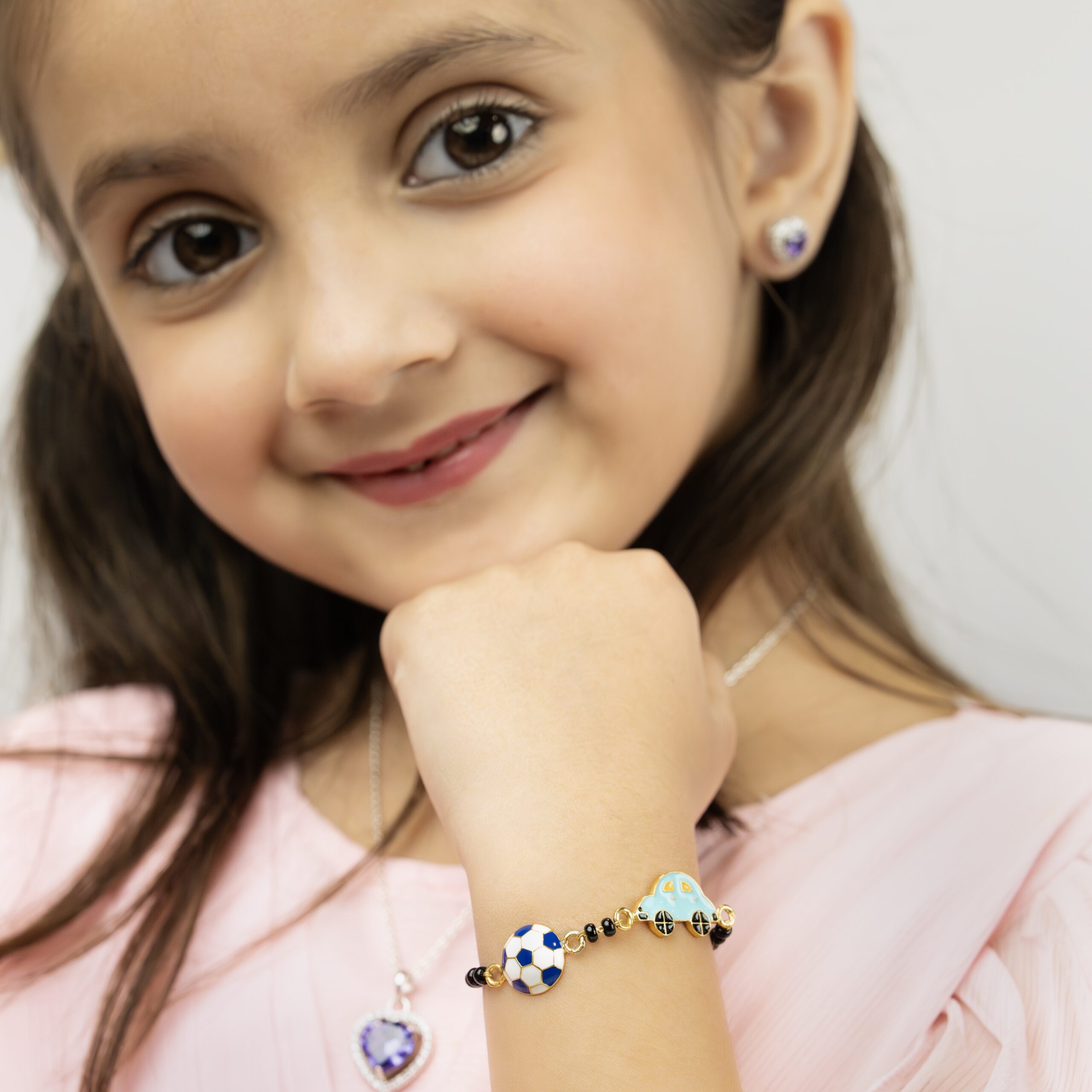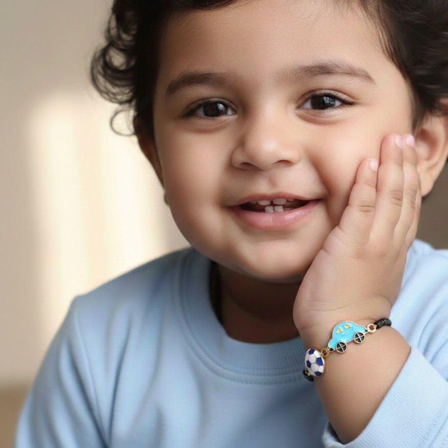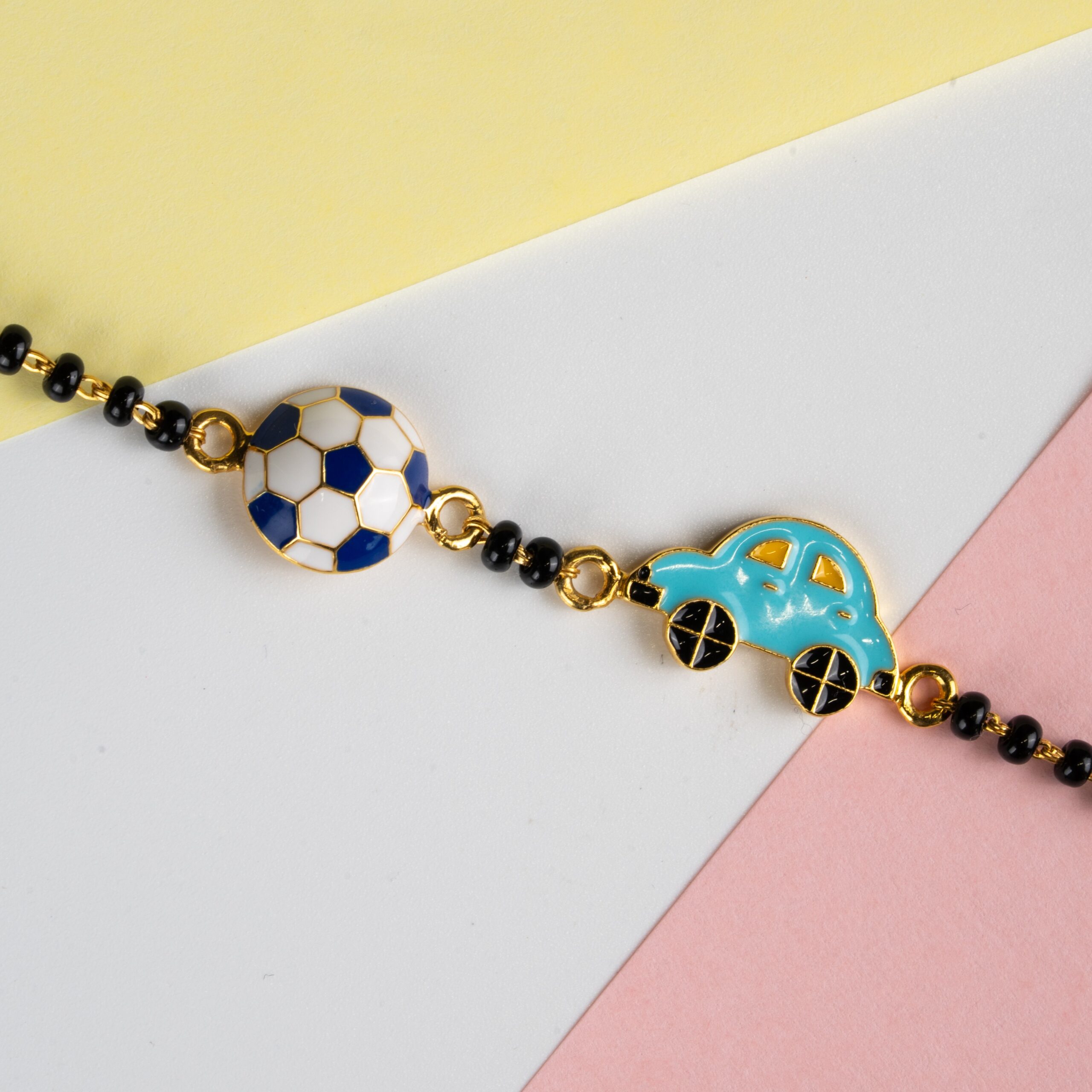 Zoom into fun with this sporty nazariya that brings together two childhood favorites – a bright blue car and a classic football! Designed for active little boys, this piece is crafted with hypoallergenic materials and traditional black beads for both charm and protection.