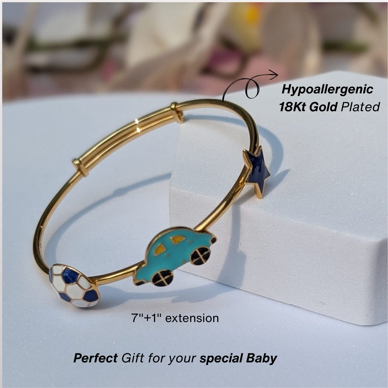 Introducing our charming silver with gold plating Bangle featuring playful car, football, and star charms, it adds a touch of sparkle to any outfit. The combination of silver and gold plating ensures durability while keeping it lightweight and comfortable for young wearers. Perfect for everyday wear, this bracelet makes a wonderful gift for little ones who adore stylish accessories.