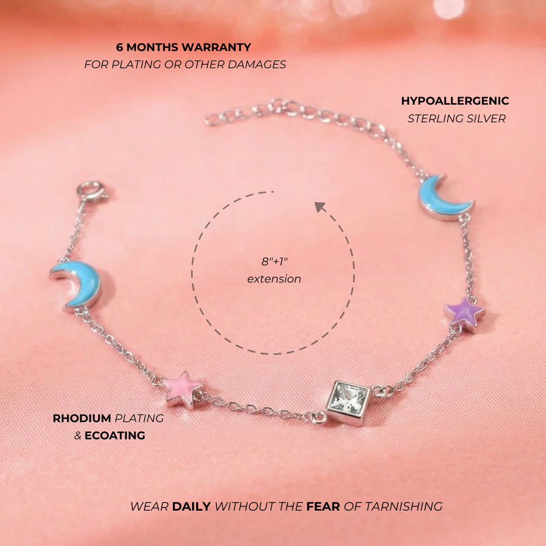 Let your little one’s imagination soar with this enchanting Celestial Dreams Pure Silver Anklet. Crafted from 925 pure, hypoallergenic silver, it’s gentle on delicate skin. The anklet features a delicate chain adorned with whimsical charms including a light blue crescent moon, a pink star, a purple star, and a sparkling cubic zirconia diamond shape.