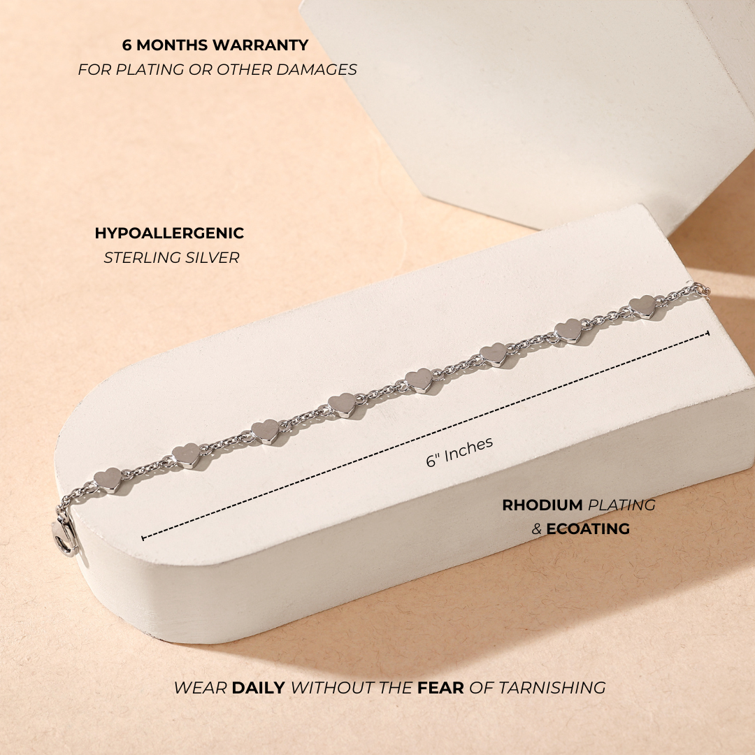 Elegantly embrace style with our exquisite chain of hearts bracelet. Crafted from premium 925 Sterling Silver, this graceful accessory is designed to perfectly complement the Little Divas taste. Its delicate chain features intricately intertwined heart motifs, adding a touch of timeless charm to any ensemble. With a comfortable length of 5.5″-6.5″, this bracelet effortlessly accentuates your wrist.