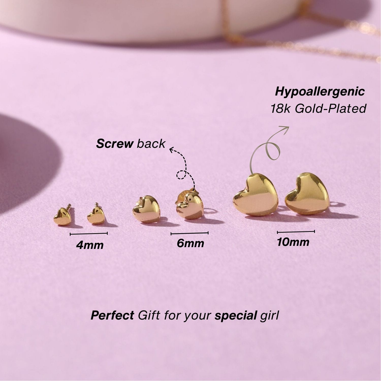 Dress up your little princess in style with these Classic Golden Heart earrings made for girls of all ages. Crafted from 925 sterling silver, these earrings are hypoallergenic, nickel-free, and perfect for kids with sensitive ears. This is from our Mom& Me collection, so you can twine with your daughter. A free gift box is provided for convenient gifting!
