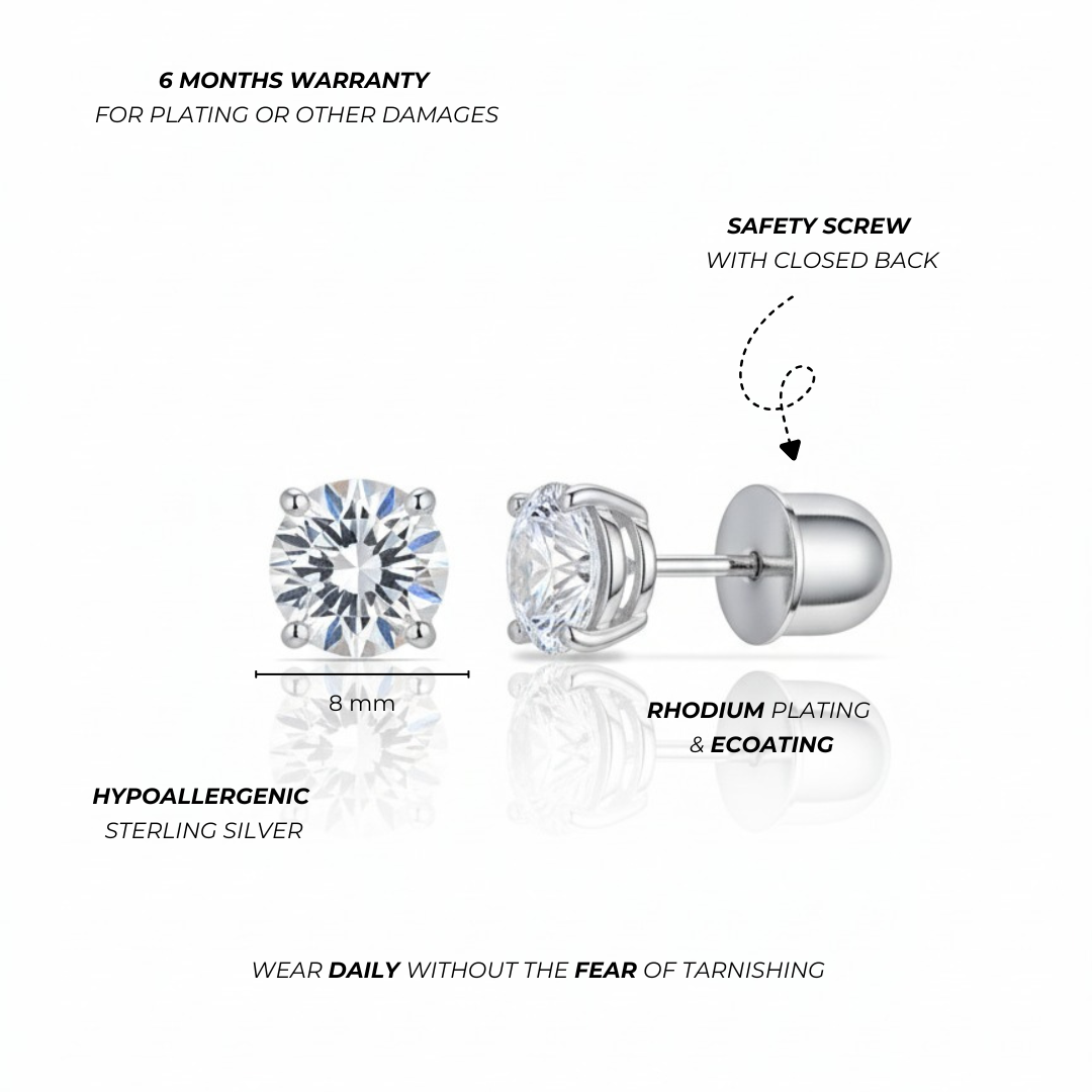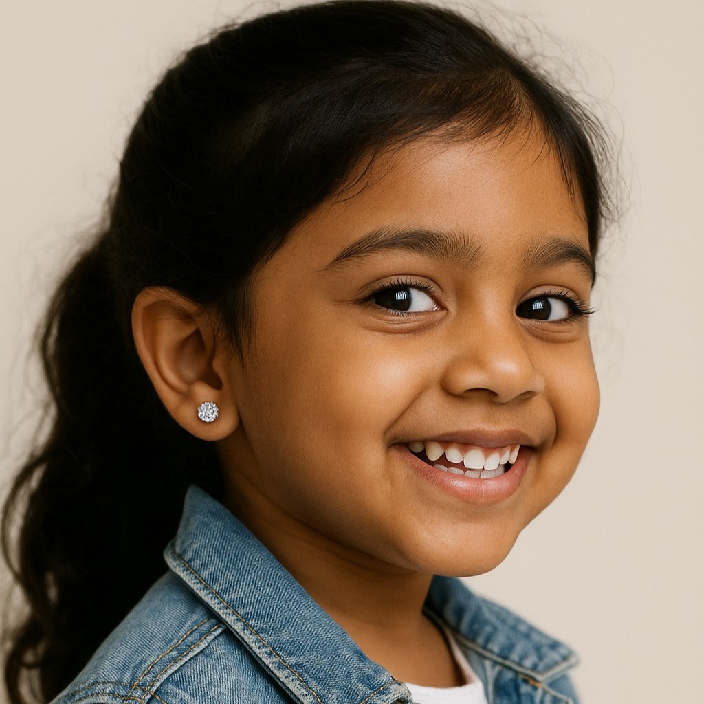Make a brilliant statement of style for your little princess with these shimmering clear CZ solitaire stud earrings for little girls of all ages. Handcrafted entirely of 925 sterling silver, these earrings are hypoallergenic, nickel-free, and safe for children with sensitive ears. The quality clear cubic zirconia stone is mounted using a classic four-prong jeweler’s setting. The threaded safety backs and posts are designed to keep your child’s earrings comfortably and safely in place at all times. A complimentary gift box is included for easy giving!