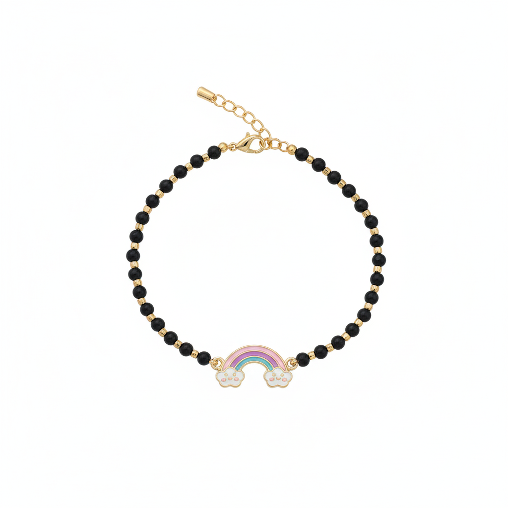 Bring color and charm to your little one’s day with the RainbowTwist Nazariya – a joyful black-bead bracelet featuring a vibrant rainbow charm and a secure twisty lock clasp for all-day comfort and safety.