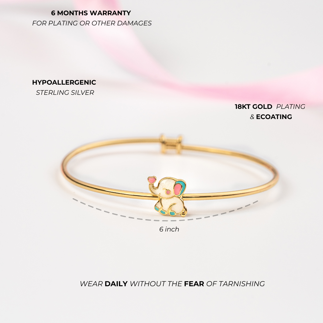 Inspire good fortune with the charming EleBuddy Bangle! This beautiful bracelet is designed for kids and girls, crafted from genuine, hypoallergenic 925 sterling silver and lavishly finished with an 18k gold plating.
