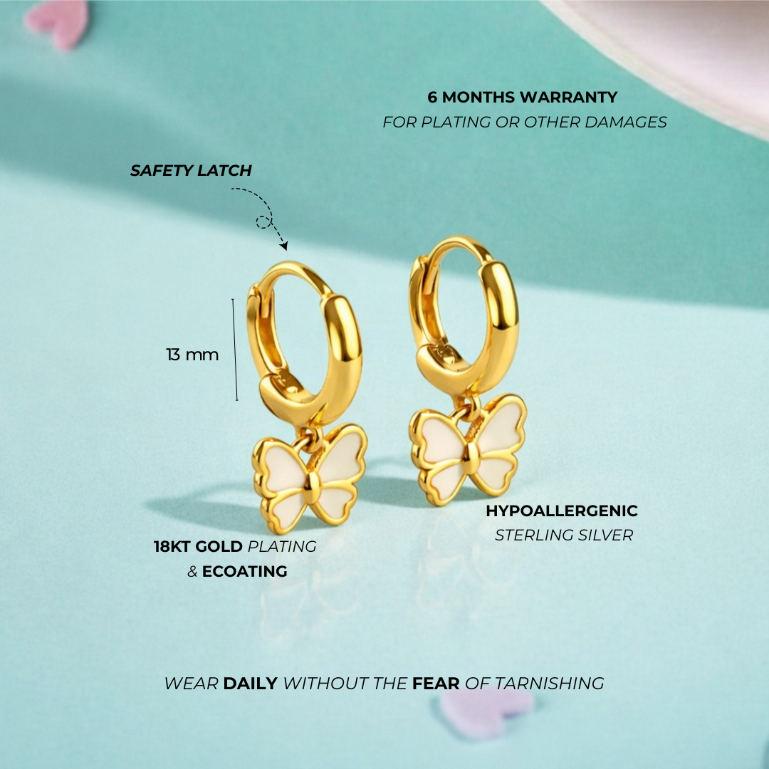 Simply Majestic!! This sweet pair of small Butterfly dangle Hoops for Little girls are crafted entirely of 925 sterling silver, they are adorned with a white butterfly that dangles delicately from them. A meaningful fine jewelry gift for a loved one, packaged into their own little gift box for your convenience.