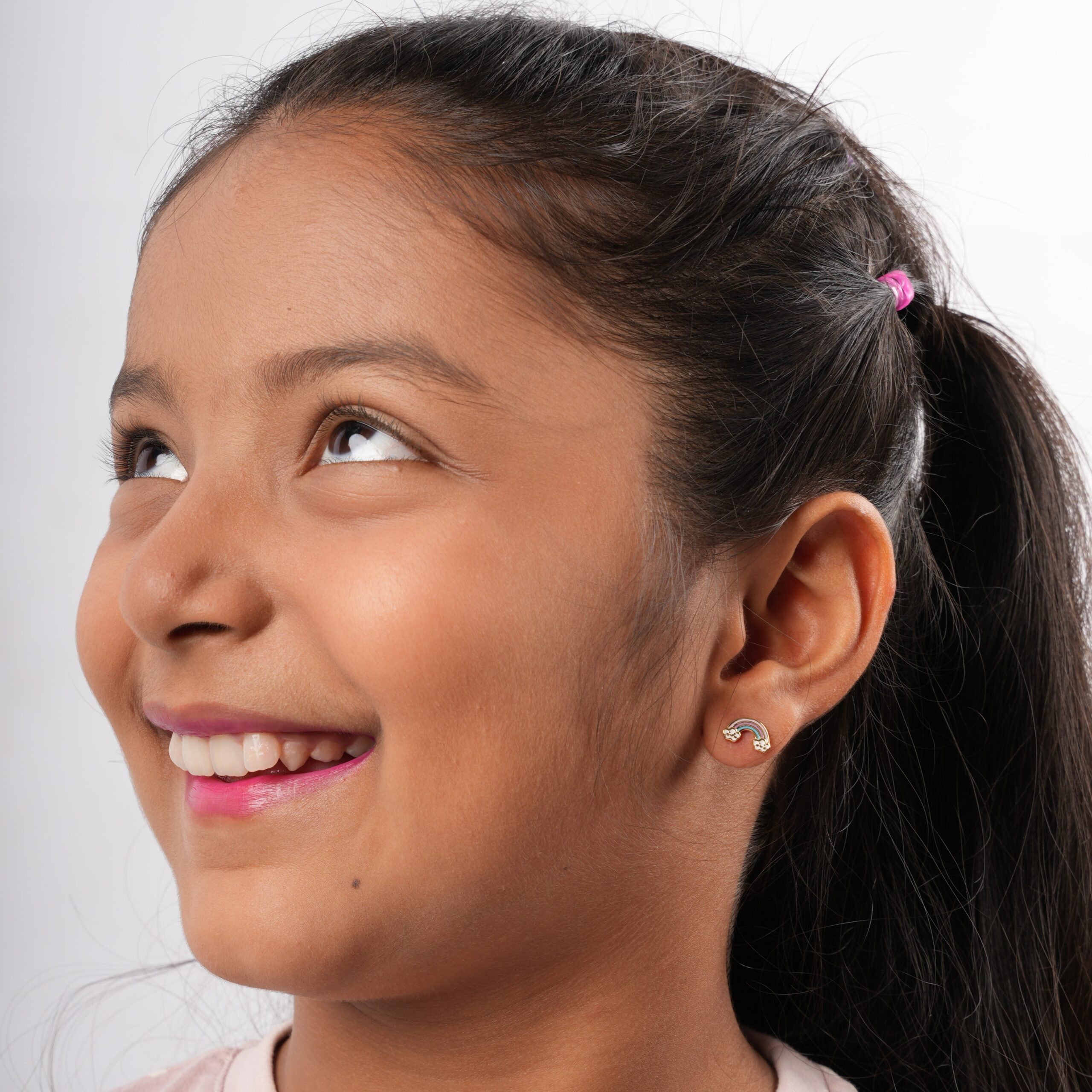 The sweetest enamel rainbow earrings that will immediately steal the heart of your little girl. Pastel enamel colors detail the rainbow on these adorable kids earrings. Crafted from 925 sterling silver, these earrings are safe for girls who have sensitive ears. A magical pair of earrings that will have her imagination above the clouds. A gift box is included with purchase.