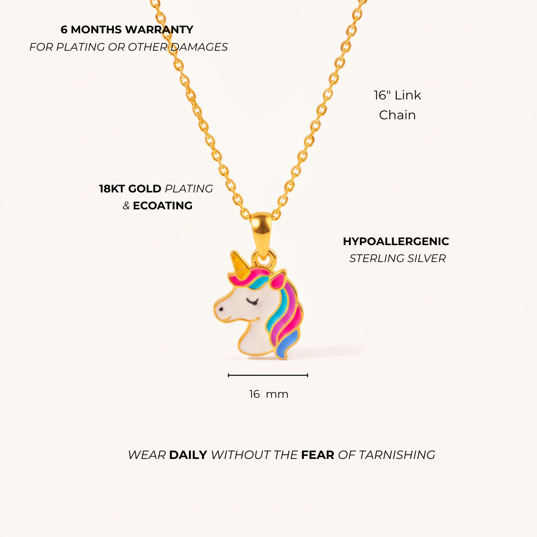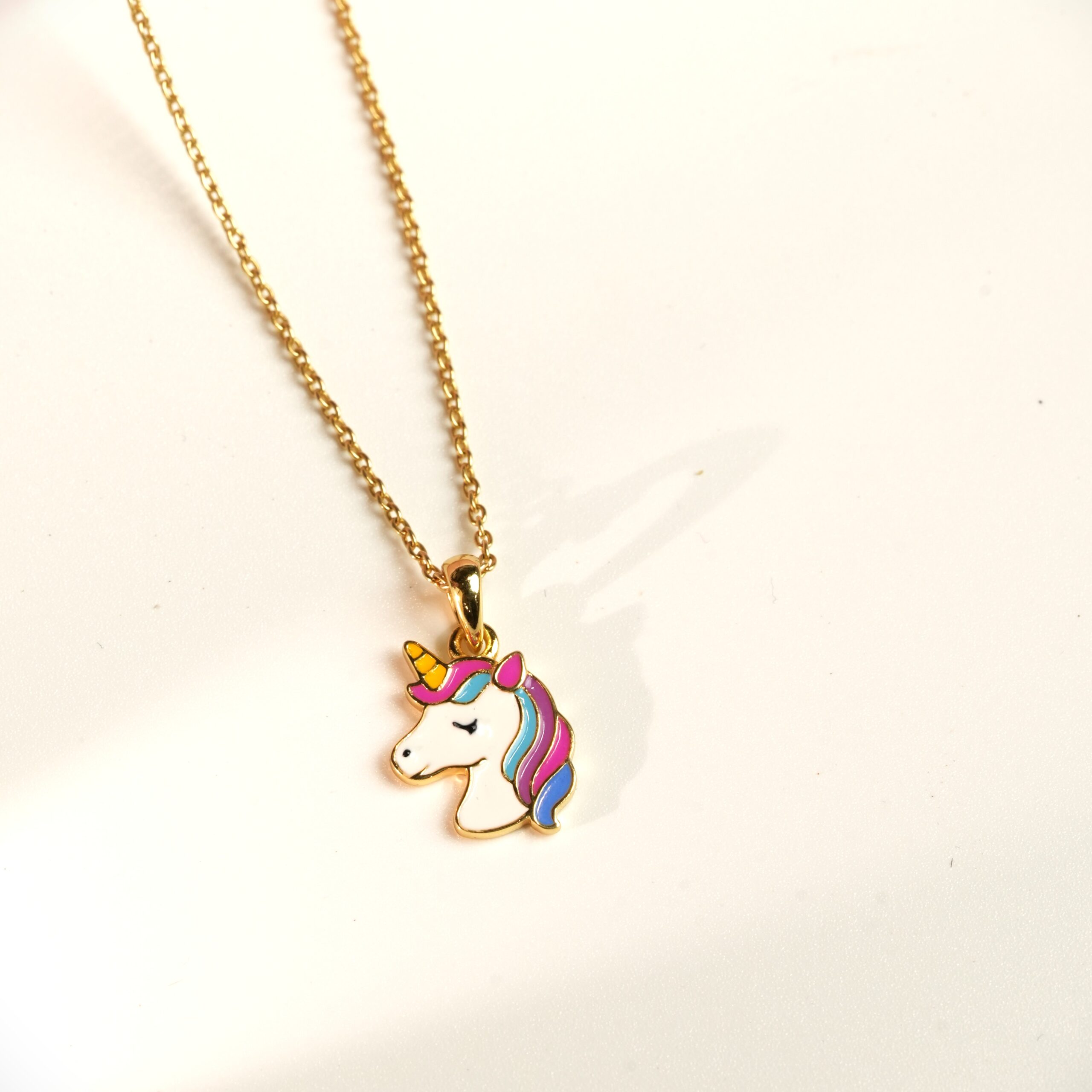- Design: Whimsical unicorn head with colorful enamel and golden horn