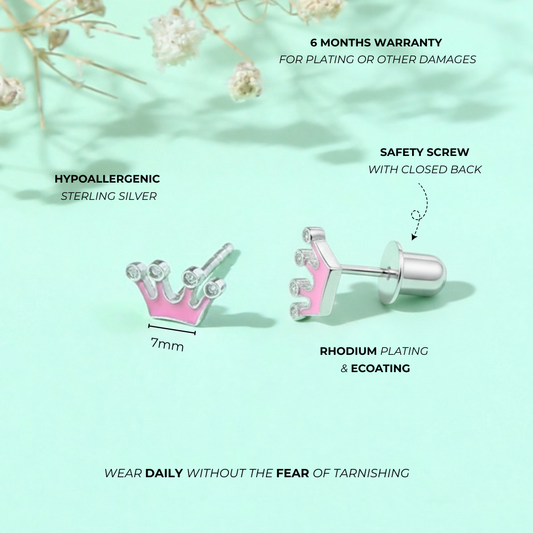 These Pink Crown Earrings, crafted in pure 925 silver and dusted with dainty blue stones, are designed to celebrate the princess within. Their graceful crown shape adds a touch of fantasy to everyday outfits, playdates, and magical moments alike.