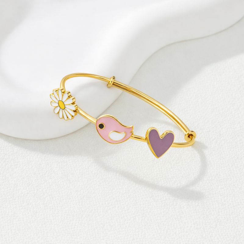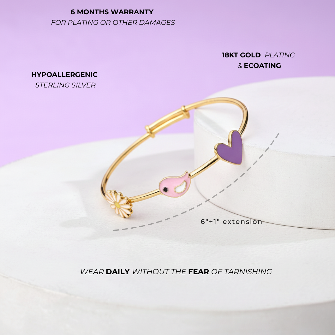 Your sweet little girl will absolutely love to wear her expandable Bird , Daisy and Heart detailed bangle! This lovely bangle features beautiful bird in centre and daisy and pastel purple heart sorrunding. This adorable girls bangle is crafted from a hypoallergenic sterling silver that is safe for you little ones sensitive skin. A complimentary gift box is included.