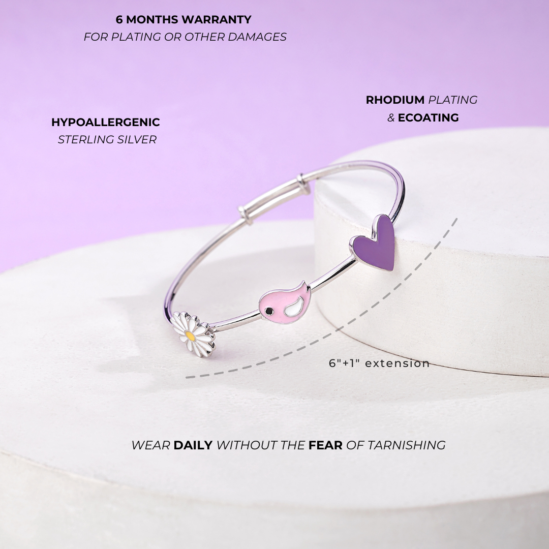 Your sweet little girl will absolutely love to wear her expandable Bird , Daisy and Heart detailed bangle! This lovely bangle features beautiful bird in centre and daisy and pastel purple heart sorrunding. This adorable girls bangle is crafted from a hypoallergenic sterling silver that is safe for you little ones sensitive skin. A complimentary gift box is included.