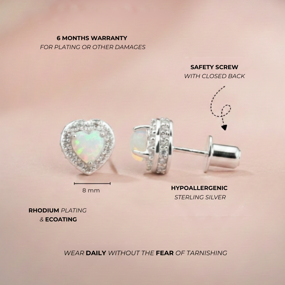 Our stunning heart shaped screw back earrings are so beautifully detailed that your little girl will never want to take them off. They are made of 925 sterling silver that are suitable for girl’s sensitive ears, with an opal stone at its center. These cute heart earrings come with safety screw back for comfort and security. They make a great gift for birthdays, festivities and any other special occasion. Gift Box Included.