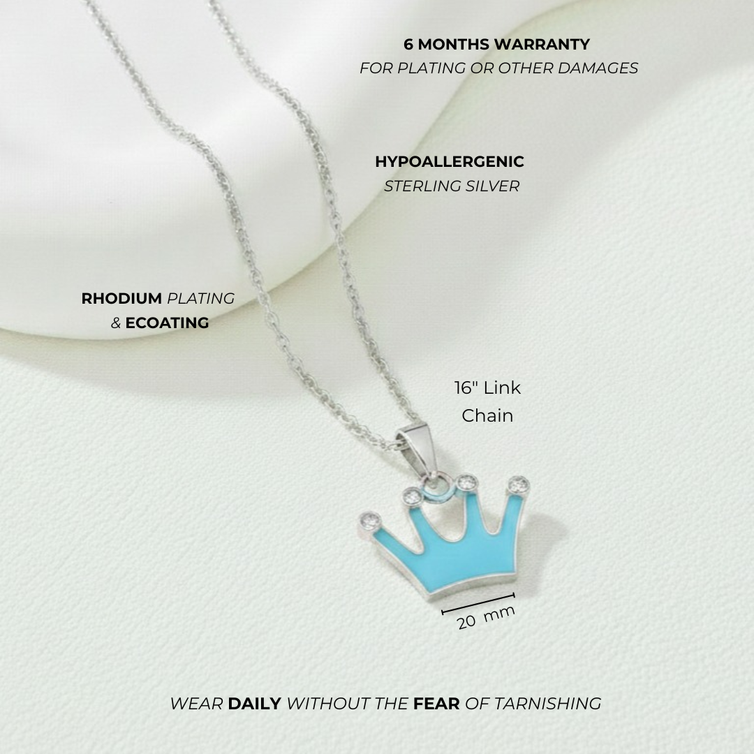 Let your little girl feel like royalty with this adorable Princess Crown Pendant. Designed for young trendsetters, this dainty crown-shaped pendant features a charming blue enamel finish and sparkling tips — perfect to pair with her favorite outfit or chain. Crafted in hallmarked 925 sterling silver with a gentle, skin-safe polish, it’s made especially for kids who love to shine.