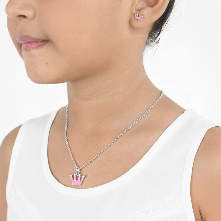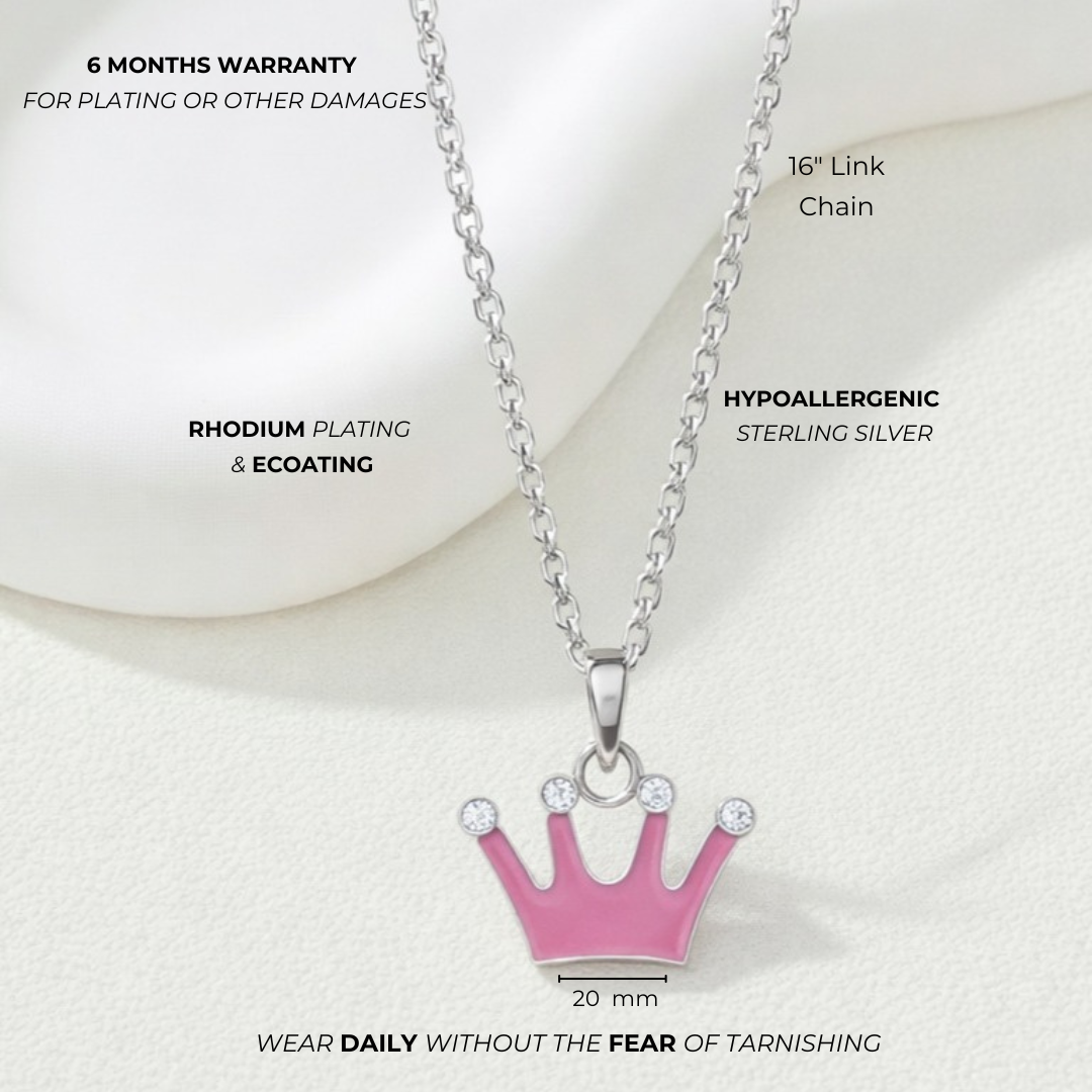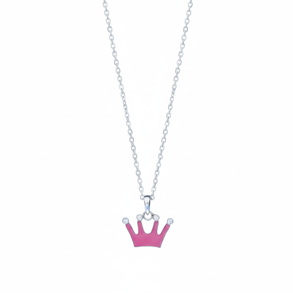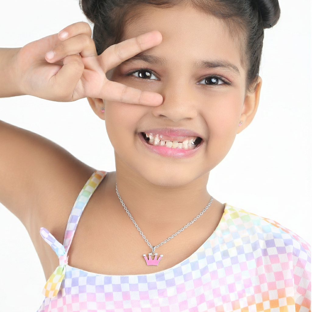 Let your little girl feel like royalty with this adorable Princess Crown Pendant. Designed for young trendsetters, this dainty crown-shaped pendant features a charming pink enamel finish and sparkling tips — perfect to pair with her favorite outfit or chain. Crafted in hallmarked 925 sterling silver with a gentle, skin-safe polish, it’s made especially for kids who love to shine.