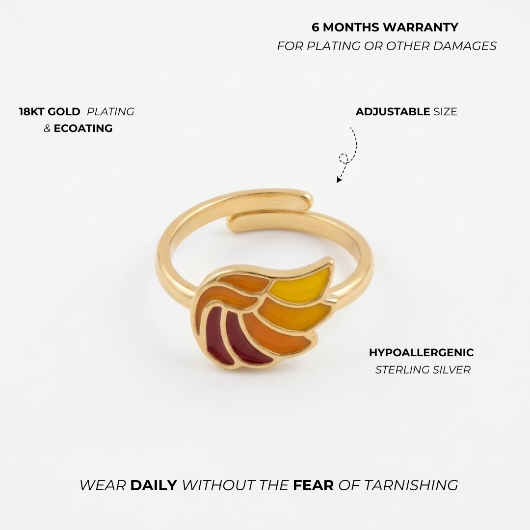 Warm and vibrant, the Sunset Phoenix Wing Adjustable Ring captures the beauty of fiery sunset tones in a delicate design. Featuring a multicolor enamel phoenix wing in shades of orange, yellow, and deep red, this ring symbolizes strength, transformation, and elegance. Crafted from 925 sterling silver with a gold-plated finish, it is hypoallergenic, making it safe and comfortable for sensitive skin. The adjustable band ensures a perfect fit for effortless everyday wear.