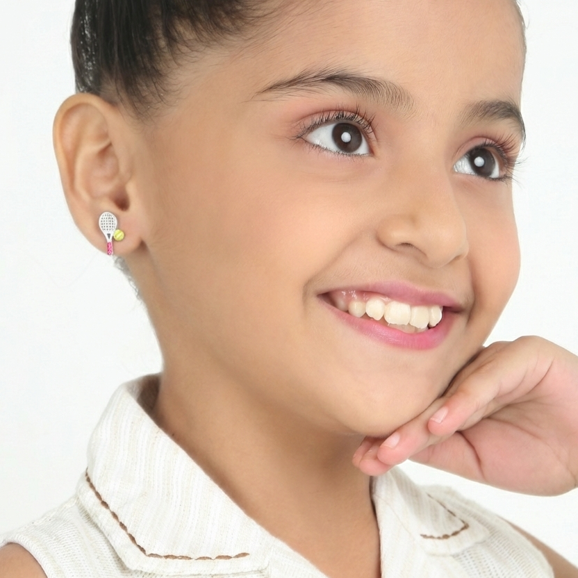 Crafted in pure silver and finished with luxurious rhodium plating, these dainty Tennis Earrings feature a charming racket-and-ball design that celebrates her love for the game. Lightweight, hypoallergenic, and full of personality—just like your little champ.
