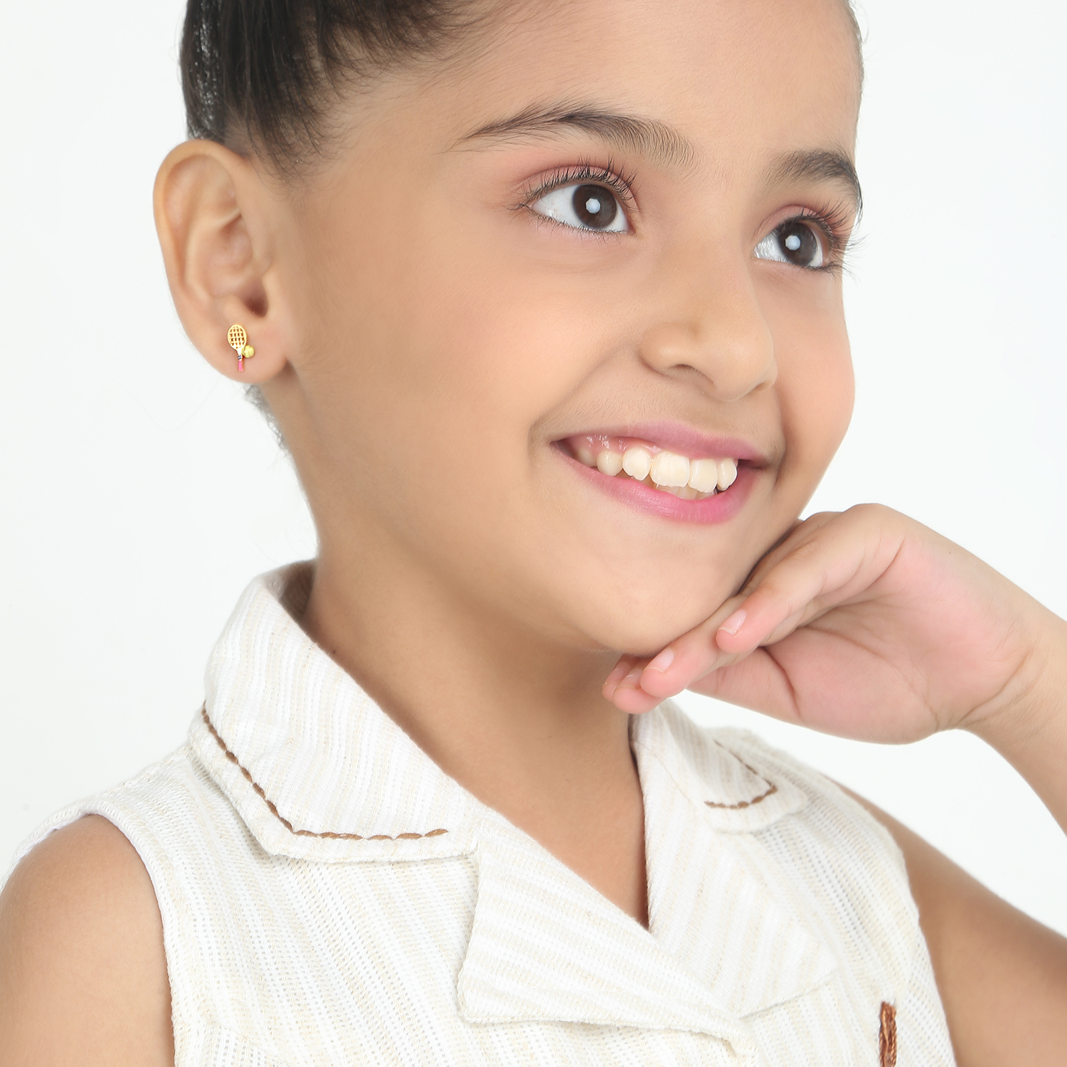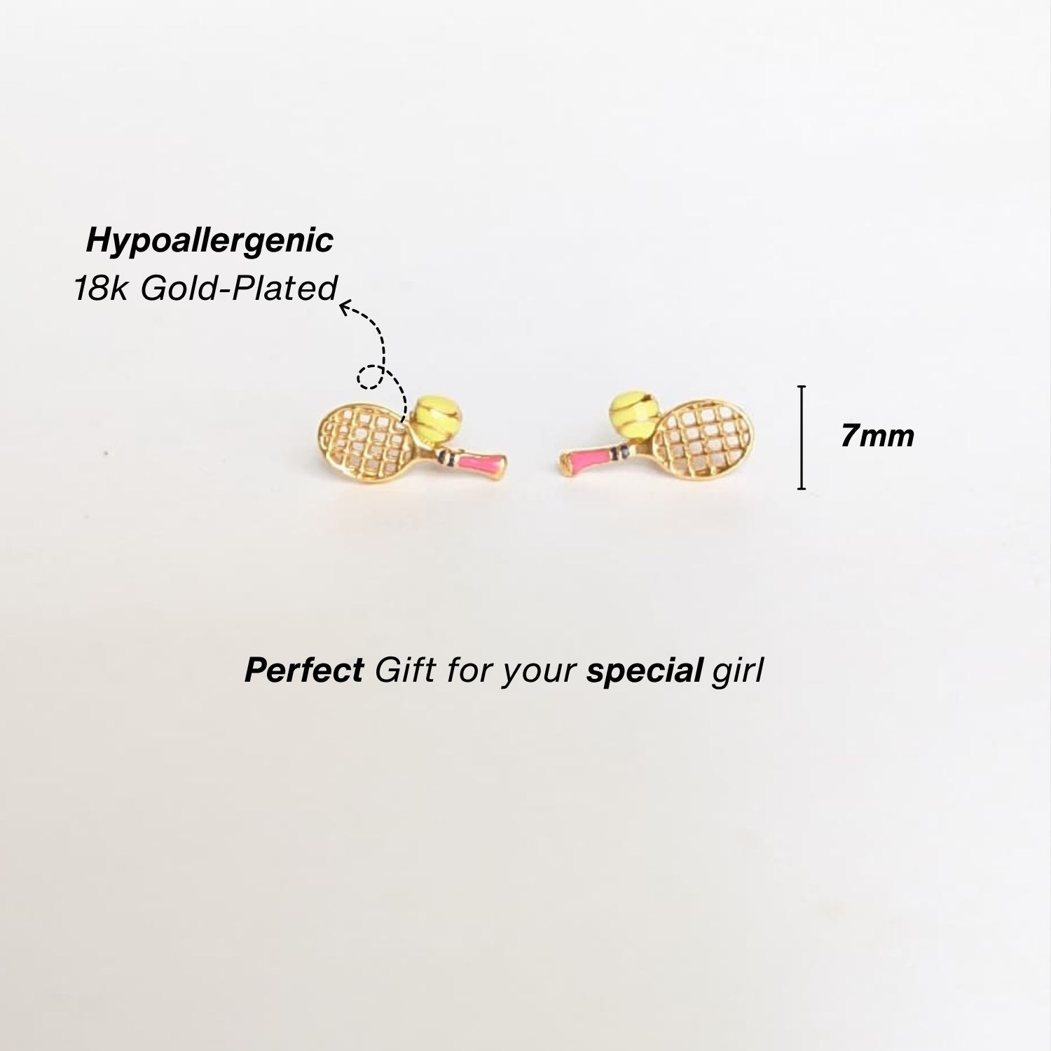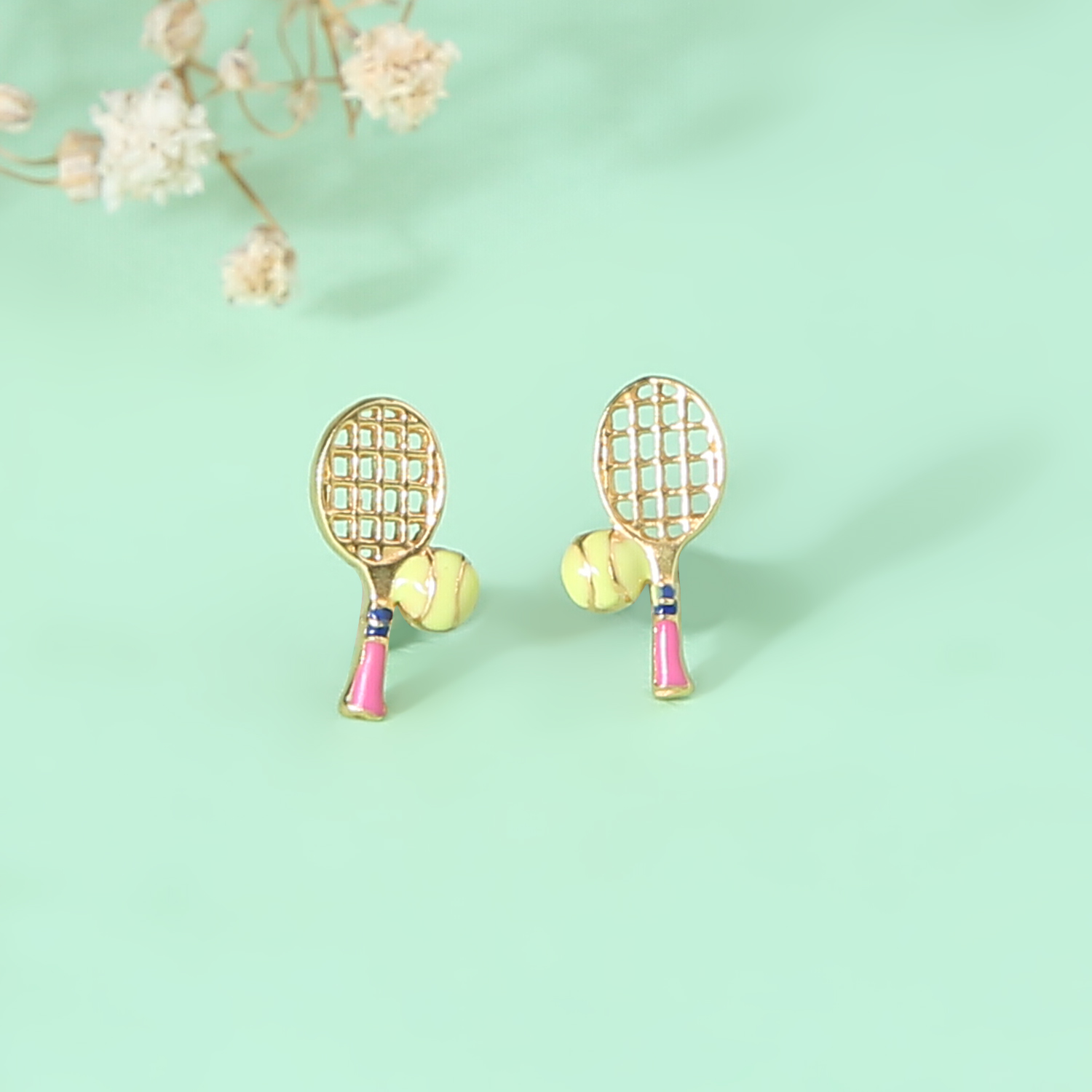 Crafted in pure silver and finished with luxurious 18kt gold plating, these dainty Tennis Earrings feature a charming racket-and-ball design that celebrates her love for the game. Lightweight, hypoallergenic, and full of personality—just like your little champ.