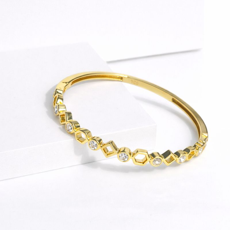 Modern. Minimal. Essential. The Horizon Geometric Bangle is the ultimate signature piece for your daily stack. Engineered from high-grade 925 Sterling Silver and dipped in a rich gold plating, this bangle features a repeating architectural pattern of circles, hexagons, and diamonds. Each geometric element is precision-set with ultra-clear crystals for a refined, low-key sparkle. This is a Limited Edition drop—once it’s gone from the archive, it’s gone.