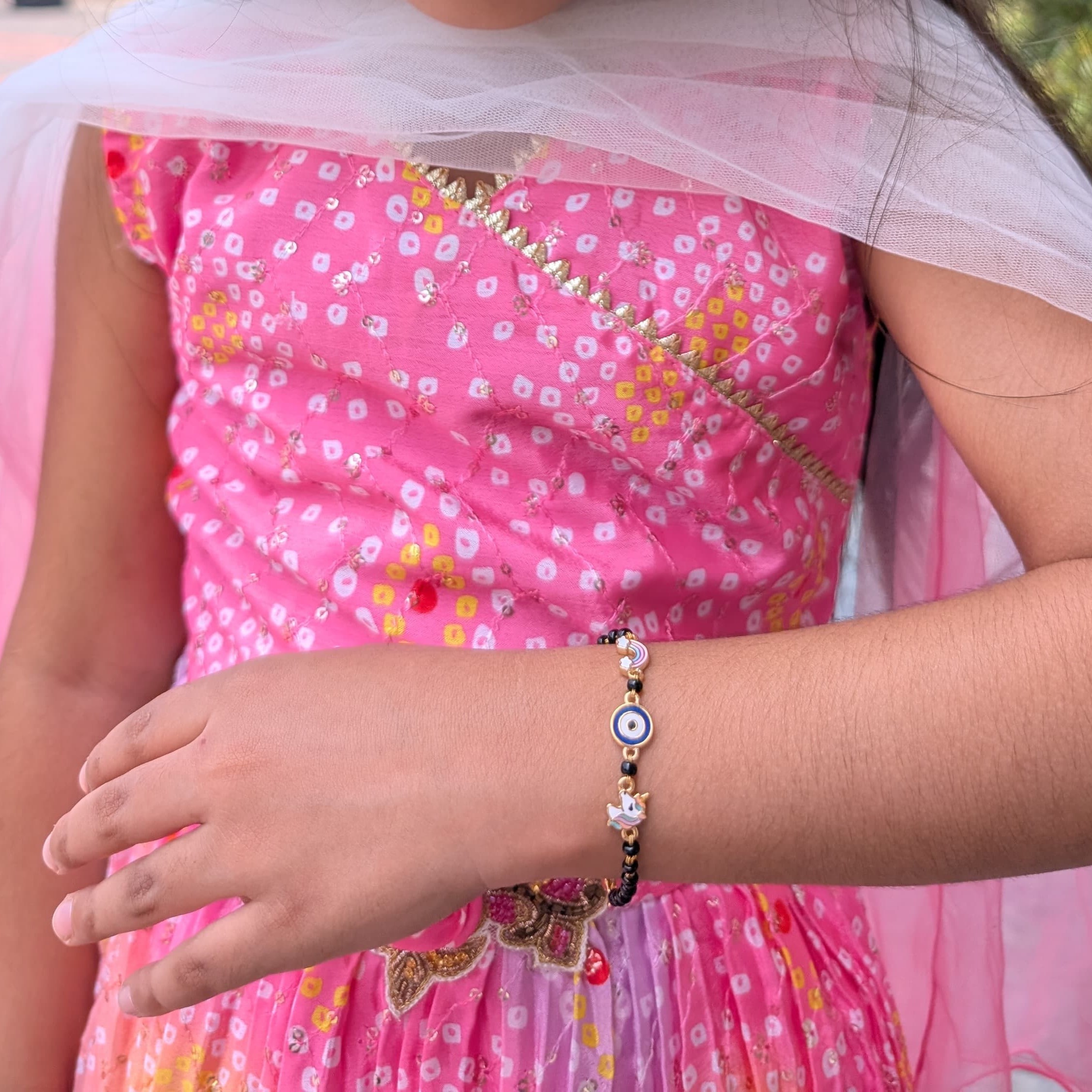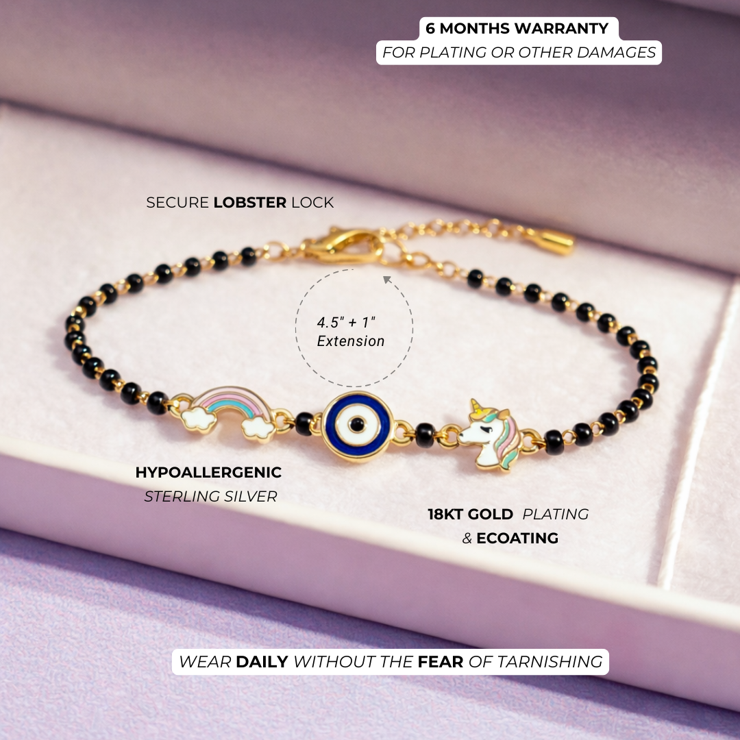 Let your little star shine with the DreamGuard Nazariya – a whimsical blend of charm, color, and tradition. Featuring a vibrant rainbow, a powerful evil eye charm, and a mystical unicorn, this bracelet brings joy, protection, and magic to your child’s everyday style.