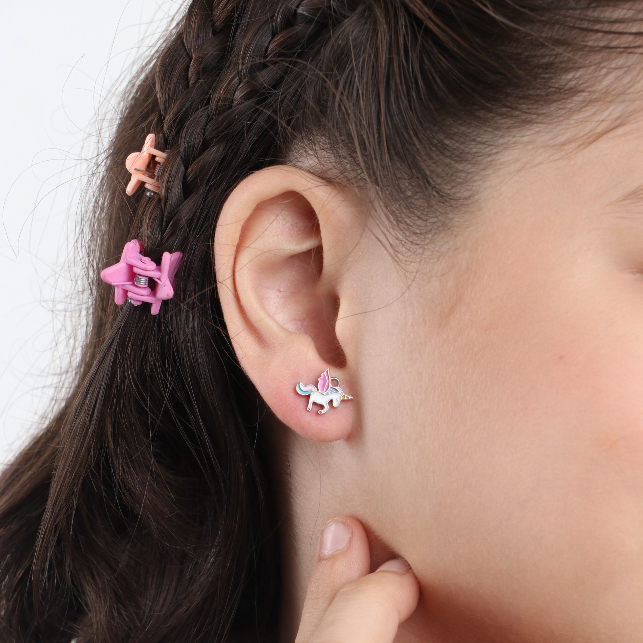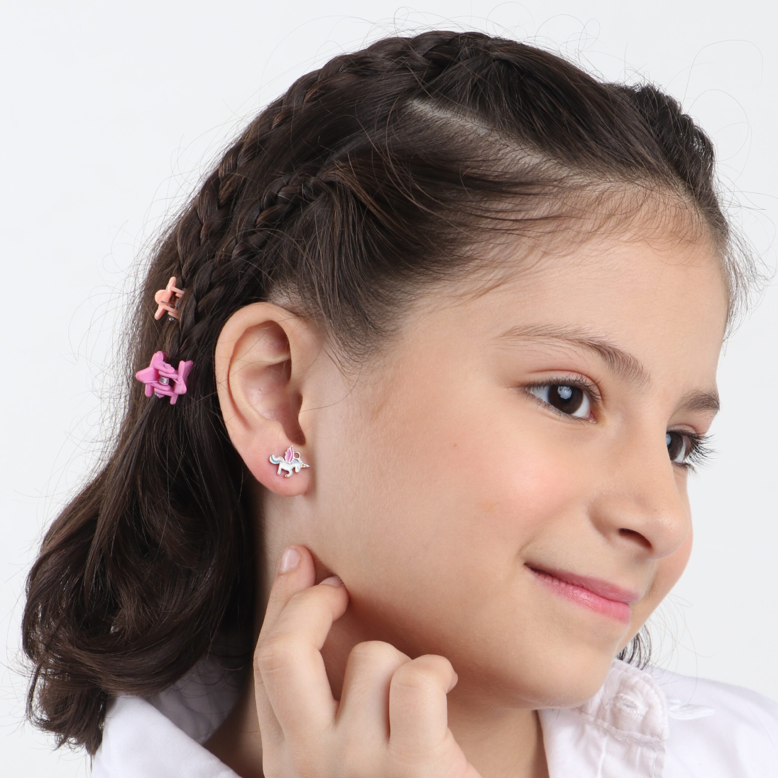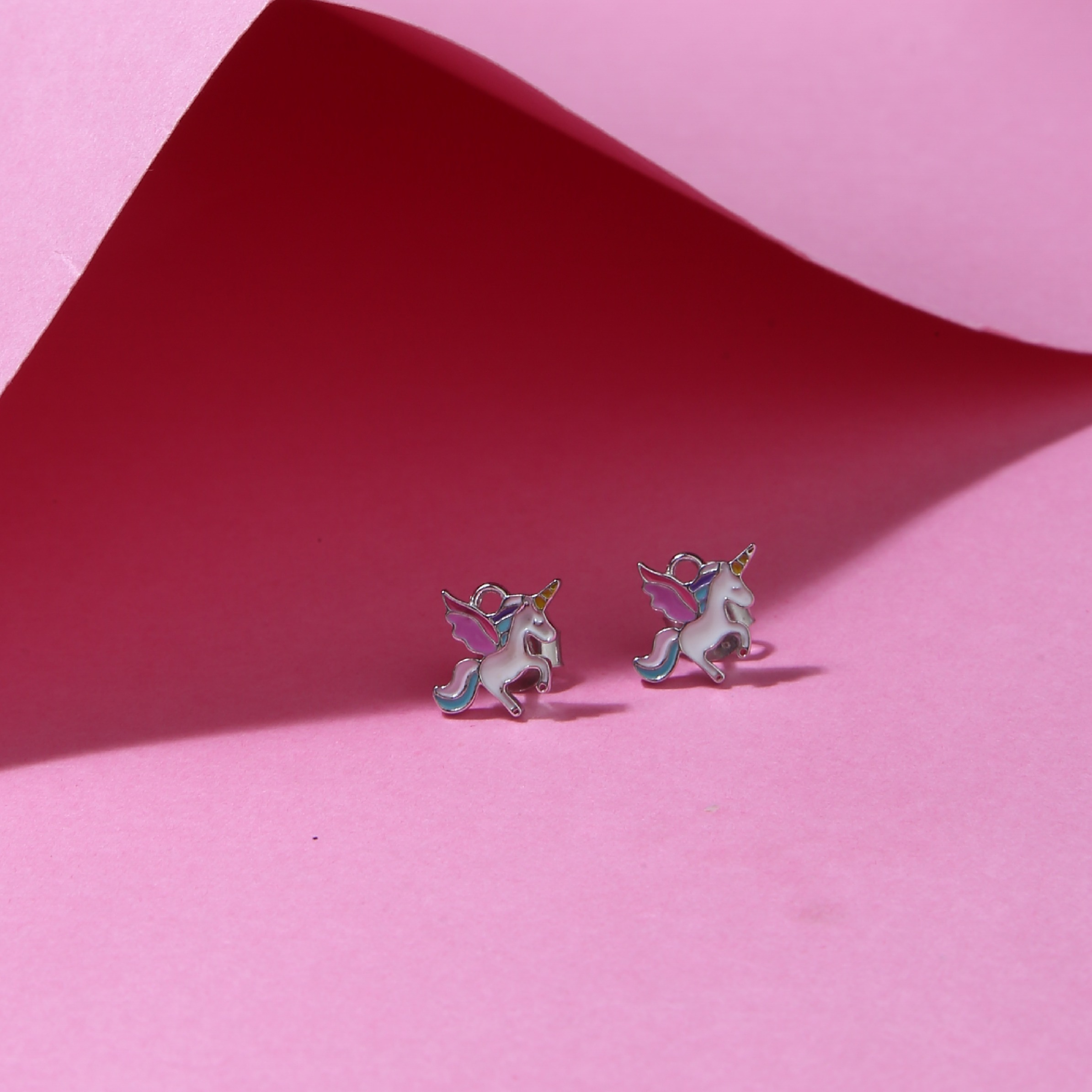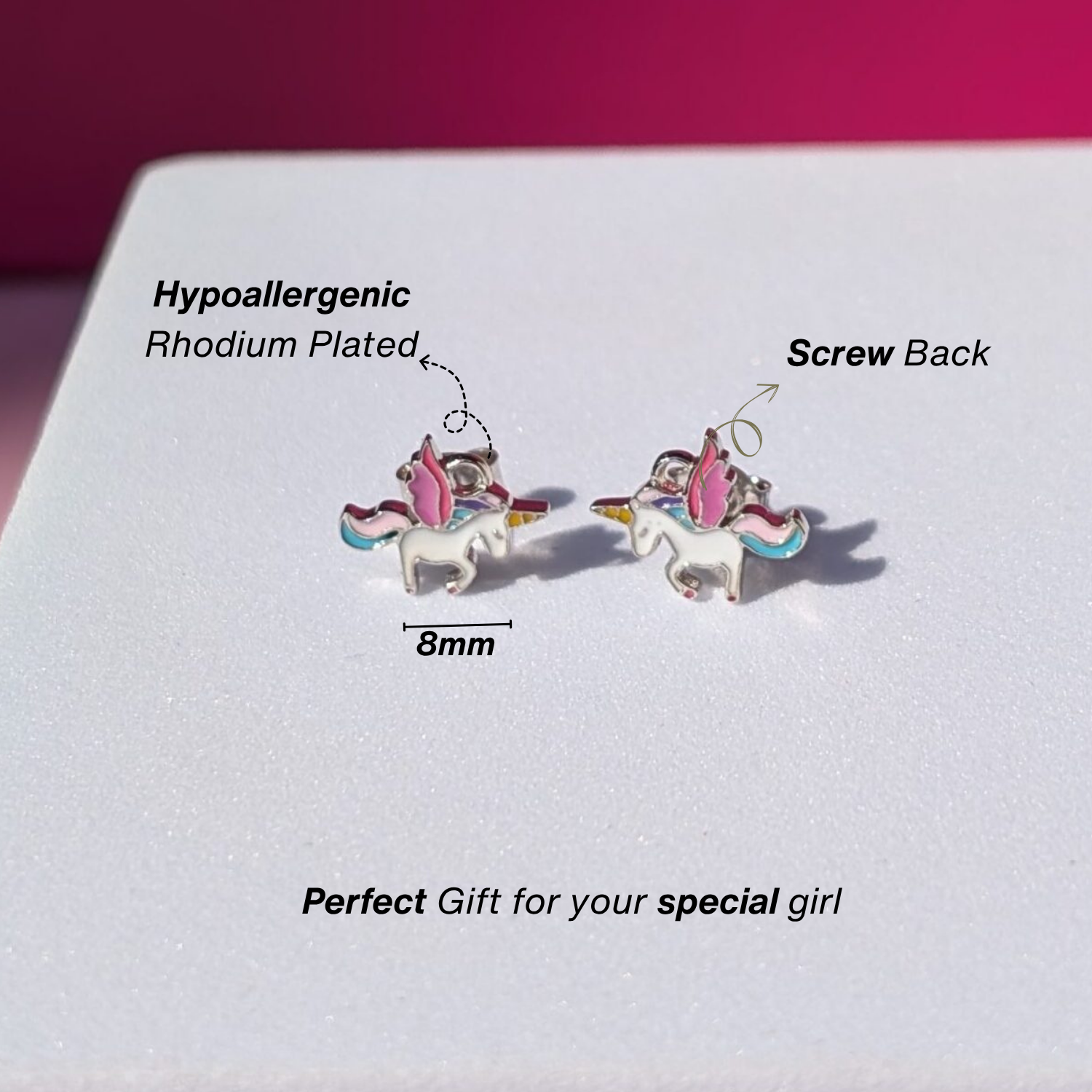 Add a smile to your little girls face with this sweet pair of flying vibrant unicorn earrings. an adorable unicorn that shines with cute colors, ideal for young girls with vibrant imaginations. these earrings are hypoallergenic and safe for sensitive skin. These fun earrings include safety screw backs, that allow the earrings to remain safely in place. Gift Box included with purchase.